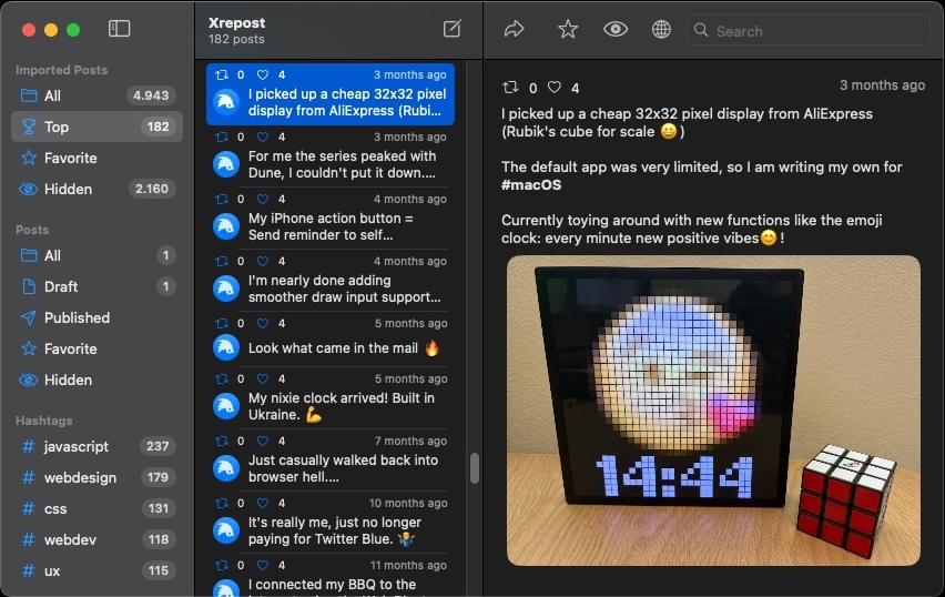 Xrepost imports and analyses your Twitter archive, then it enables you to select, edit, and repost your best tweets.